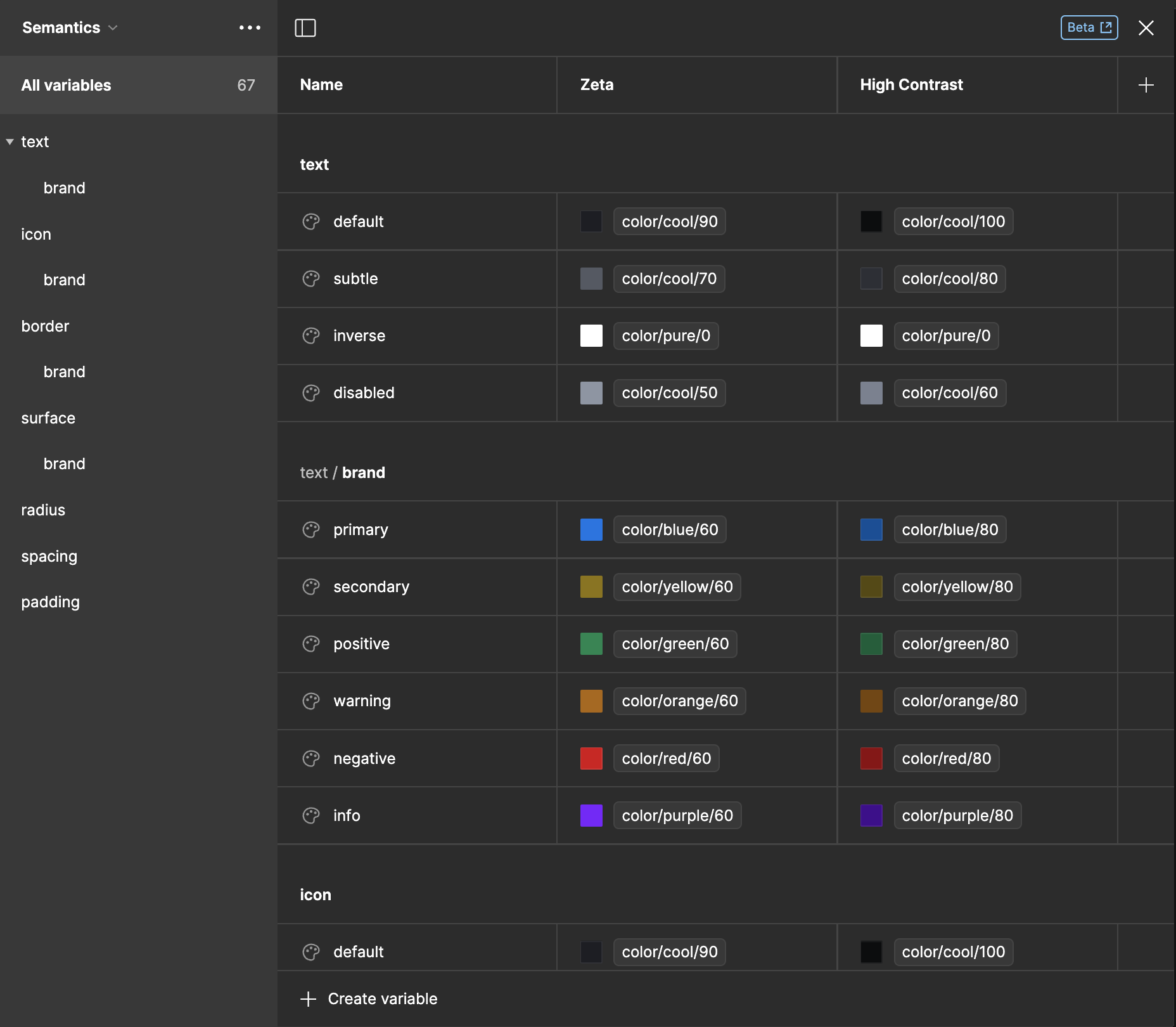 We decided to do something different with our primitives. We utilized our inverse color grind from our previous system & used that to become the foundation for our primitives. This allowed us to have an inherent light & dark mode for every single semantic token, theme & subsequent collection. There are certain cases where we’ve had to change a primitive value, for example color/cool/80 in dark mode because we felt the slightly lighter value worked better than its original inverse value.